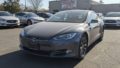 紺色のテスラ自動車が走っている画像